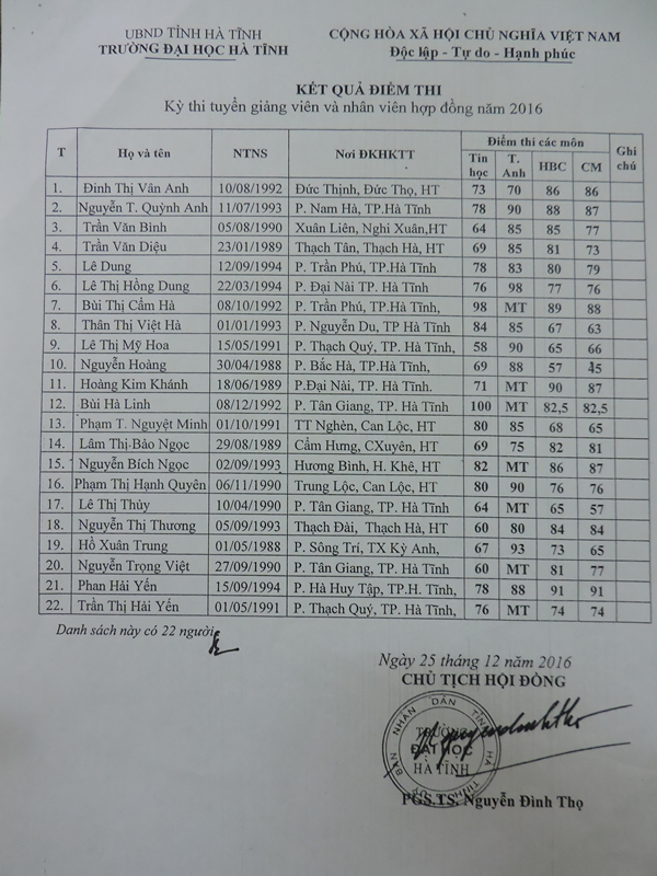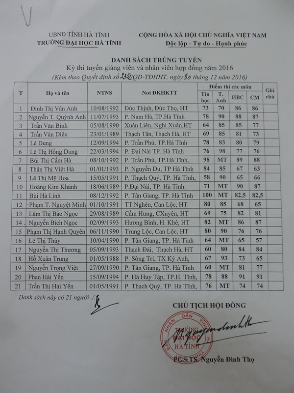 Công nhận trúng tuyển giảng viên, nhân viên hợp đồng năm 2016