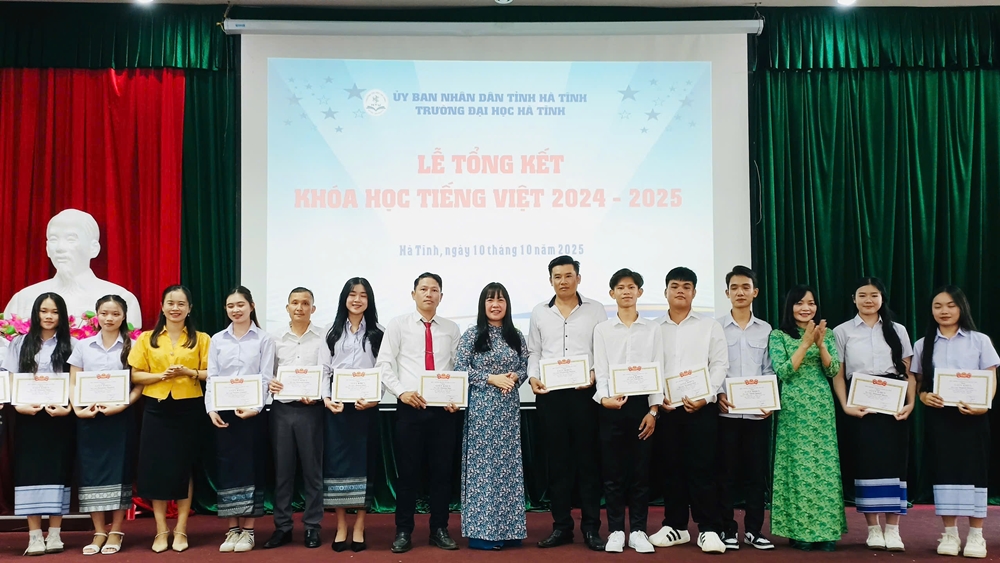 Ngày 10/10/2025, Trường Đại học Hà Tĩnh long trọng tổ chức Lễ Tổng kết khóa học tiếng Việt năm học 2024-2025 cho 77 lưu học sinh Lào K17. Buổi lễ diễn ra trong không khí ấm áp, thắm đượm tình hữu nghị Việt - Lào. Tham dự buổi lễ có sự hiện diện của TS. Trần Thị Ái Đức - Phó Hiệu trưởng Nhà trường, cùng đại diện lãnh đạo các phòng ban, khoa và toàn thể giảng viên Khoa Tiếng Việt.