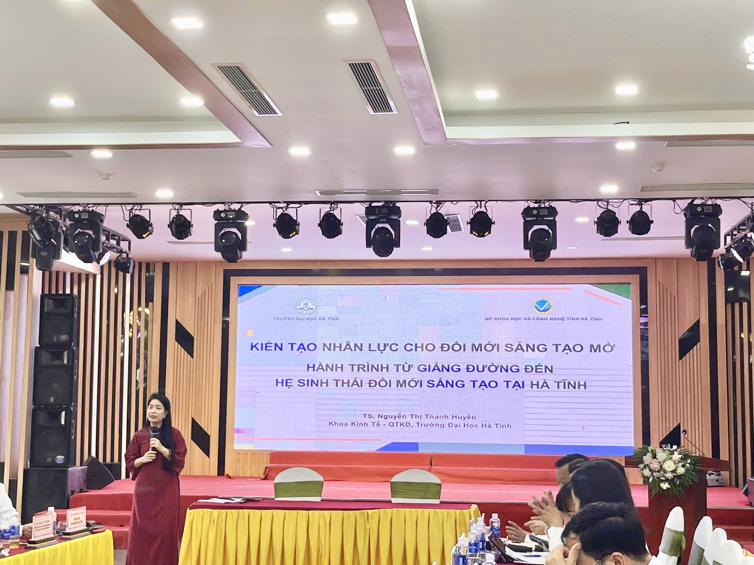 Từ góc nhìn giáo dục đại học, TS. Nguyễn Thị Thanh Huyền (Trường Đại học Hà Tĩnh) trình bày tham luận “Từ giảng đường đến hệ sinh thái đổi mới sáng tạo – Hành trình kiến tạo nhân lực phục vụ đổi mới sáng tạo mở tại Hà Tĩnh”, nhấn mạnh con người là trung tâm của đổi mới sáng tạo và đề xuất nhiều giải pháp gắn đào tạo với thực tiễn doanh nghiệp, xây dựng không gian sáng tạo cho sinh viên.