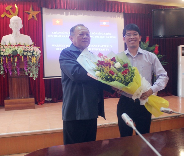 Đại diện lãnh đạo Sở Giáo dục và Thể thao thủ đô Viêng Chăn và Hiệu trưởng Trường Đại học Hà Tĩnh tặng hoa và quà chào mừng