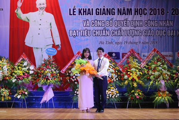 Đặc biệt trong năm học 2017-2018, Trường Đại học Hà Tĩnh đã được Trung tâm Kiểm định chất lượng giáo dục – Đại học Quốc gia Hà Nội đánh giá chất lượng giáo dục. Đây là một dấu mốc mới khẳng định sự phát triển của nhà trường trên tất cả các mặt hoạt động. Nhân dịp này, TS. Tạ Thị Thu Hiền, Phó Giám đốc phụ trách Trung tâm Kiểm định chất lượng giáo dục - Đại học Quốc gia Hà Nội trao chứng nhận và tặng lẵng hoa chúc mừng nhà trường.